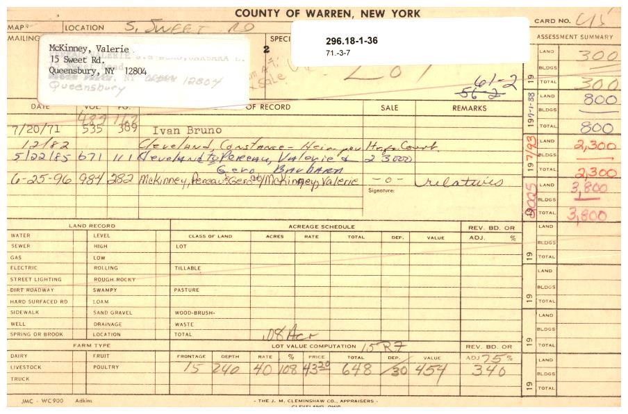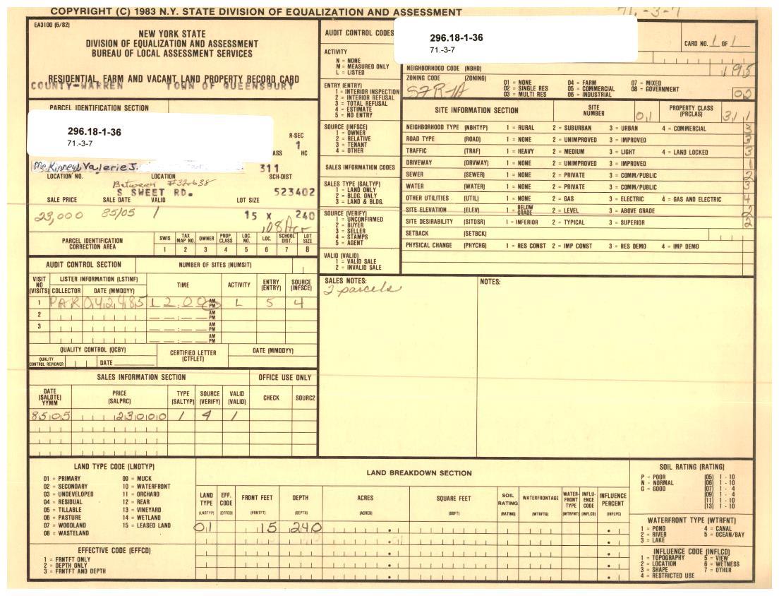 | 296.18-1-36 | Sweet Rd | 0.08 | 311 - Res vac land | Queensbury Un.fr.sd | Ward 1 |